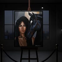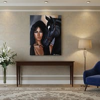 An original handmade painting portraying strength and dignity through a powerful visual bond between a woman and a black horse. A unique fine art piece representing the expressive realism style of Alaaur®.