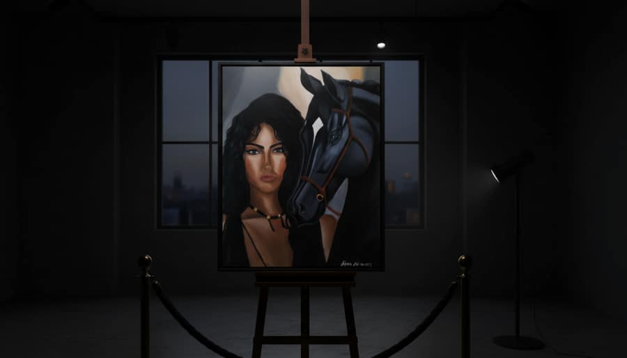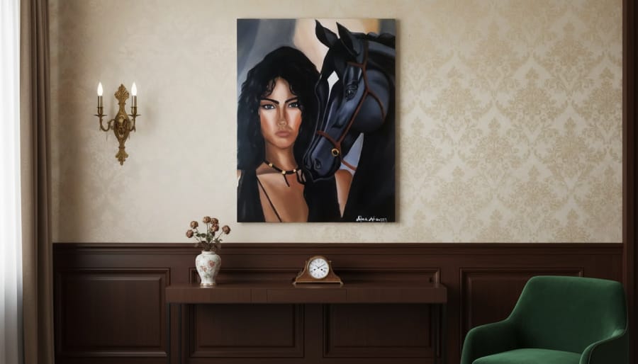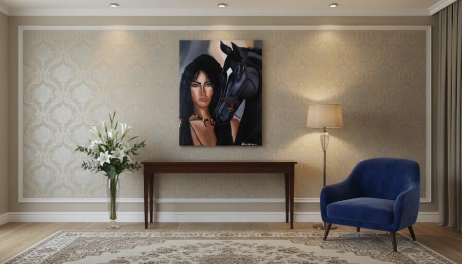 An original handmade painting portraying strength and dignity through a powerful visual bond between a woman and a black horse. A unique fine art piece representing the expressive realism style of Alaaur®.